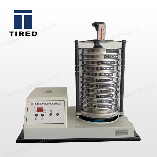 本機(jī)和標(biāo)準(zhǔn)篩一起用于測(cè)定造型材料粒度分布情況。其結(jié)構(gòu)由微型計(jì)算機(jī)系統(tǒng)、罩子、機(jī)體等部分組成。本機(jī)托盤(pán)是用S型扳簧支撐,電磁鐵做周期性吸動(dòng),使托盤(pán)作巡回往復(fù)的螺旋線震動(dòng)。電磁鐵電源主電路是由四只硅二極管接成橋路(供交流通路)和一只可控硅管組成的交流開(kāi)關(guān)電路,使電磁鐵周期性激磁。可控硅觸發(fā)信號(hào)是用計(jì)算機(jī)控制調(diào)節(jié)工作頻率。